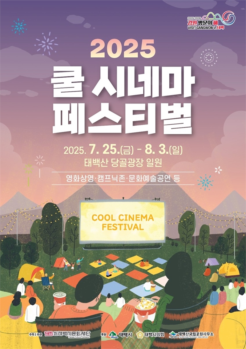 이어지는 쿨시네마 페스티벌은 7월 25일부터 8월 3일까지 태백산 당골광장에서 열린다. 영화 상영은 물론 캠프닉존, 문화예술 공연 등이 어우러져 자연 속에서 여름밤의 낭만을 즐길 수 있는 힐링형 문화행사로 진행된다. 포스터는 야외 영화관 콘셉트를 바탕으로 태백산의 황혼 풍경을 담아내며 축제의 감성을 강조했다.