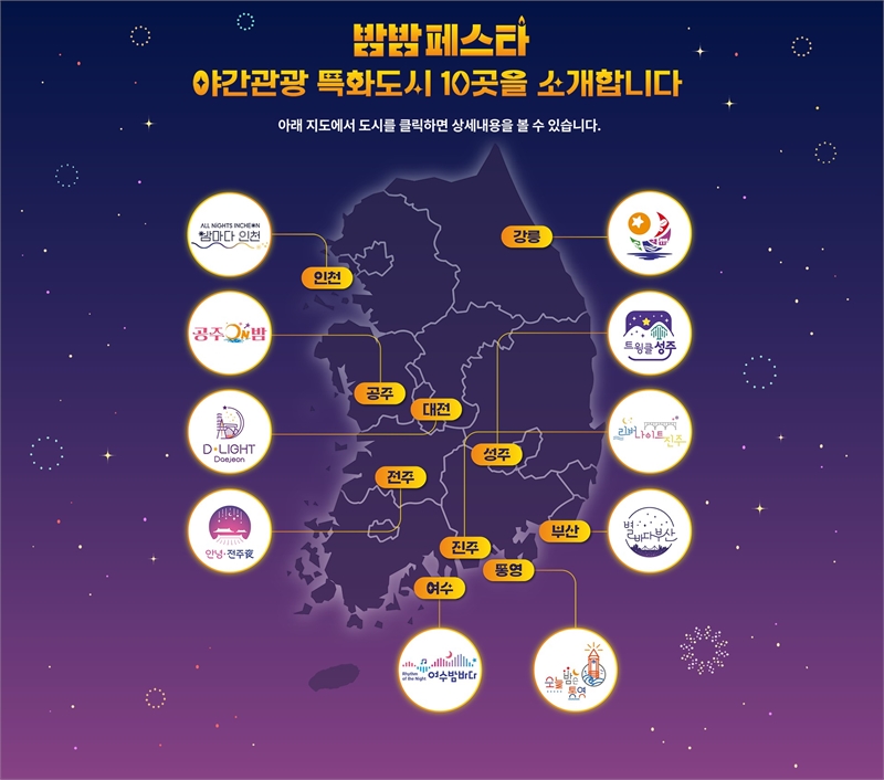 참여 도시는 인천, 부산, 공주, 강릉, 통영, 여수, 전주, 진주, 대전, 성주로, 모두 2022년부터 야간관광 특화도시로 지정돼 콘텐츠 개발 및 관광 편의 개선 등의 지원을 받아왔다. 축제는 매일 오후 6시부터 자정까지 각 도시별 특색 있는 야간 콘텐츠로 채워질 예정이다.