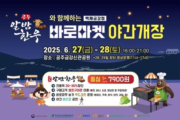 공주시가 광역 직거래 장터 ‘바로마켓 백제금강점’을 오는 27일과 28일 양일간 오후 4시부터 9시까지 야간 개장한다. 이번 특별 개장은 지역 대표 특산물인 ‘공주알밤한우’를 주제로 여름철 무더위를 피해 즐길 수 있는 미식 야간 프로그램으로 마련됐다.