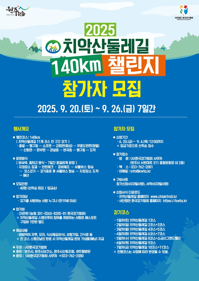 사단법인 한국걷기협회가 ‘2025 치악산둘레길 140km 챌린지’ 참가자 40명을 선착순으로 모집한다. 이번 챌린지는 자연과 함께 걷는 즐거움을 널리 알리고 시민들의 건강 증진을 목표로 기획된 장거리 걷기 프로그램이다.