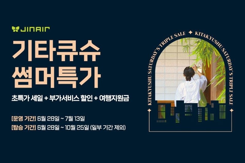 진에어가 인천기타큐슈 노선 탑승객을 대상으로 6월 28일부터 7월 13일까지 특별 프로모션을 진행한다고 밝혔다. 인천기타큐슈 노선은 현재 진에어가 국적사 중 유일하게 운항 중인 노선으로, 인천국제공항 제2여객터미널에서 매일 오전 9시 40분 출발하며, 기타큐슈에서는 낮 12시에 출발해 운항된다.