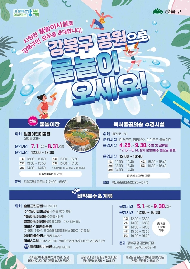 서울 강북구(구청장 이순희)가 본격적인 여름철을 맞아 구민들이 도심 속에서 시원하게 물놀이를 즐길 수 있도록 관내 공원 내 물놀이형 시설을 본격 운영한다고 밝혔다.