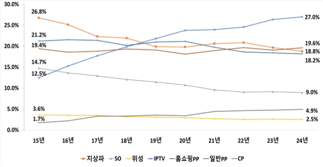 매체별 방송사업매출 점유율 변동 추이(2015년~2024년). 방송통신위원회 제공.