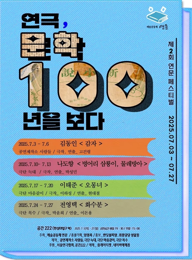 예술공동체 연문이 오는 7월 3일부터 27일까지 서울 성북구 공간222에서 '연극, 문학 100년을 보다'를 주제로 제2회 연문페스티벌을 개최한다. 연문페스티벌은 우리나라 명작소설을 연극 무대로 풀어내는 문학 기반 공연예술 축제로, 공연 제작소 사람들, 극단 마음같이, 극단 목수, 극단 늑대 등 대학로에서 활발히 활동 중인 4개 극단이 함께한다.