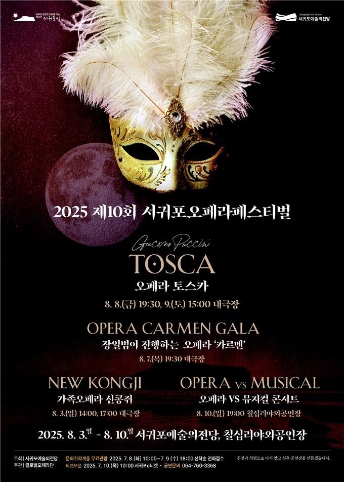 이어 8월 8일 오후 7시 30분과 9일 오후 3시에는 소프라노 임세경, 테너 김재형, 바리톤 박정민 등 국내 정상급 성악가들이 출연하는 전막 오페라 ‘토스카’가 공연된다. 마지막 무대는 10일 오후 7시 칠십리야외공연장에서 ‘오페라 VS 뮤지컬’이라는 주제로 다채로운 무대를 선보인다.