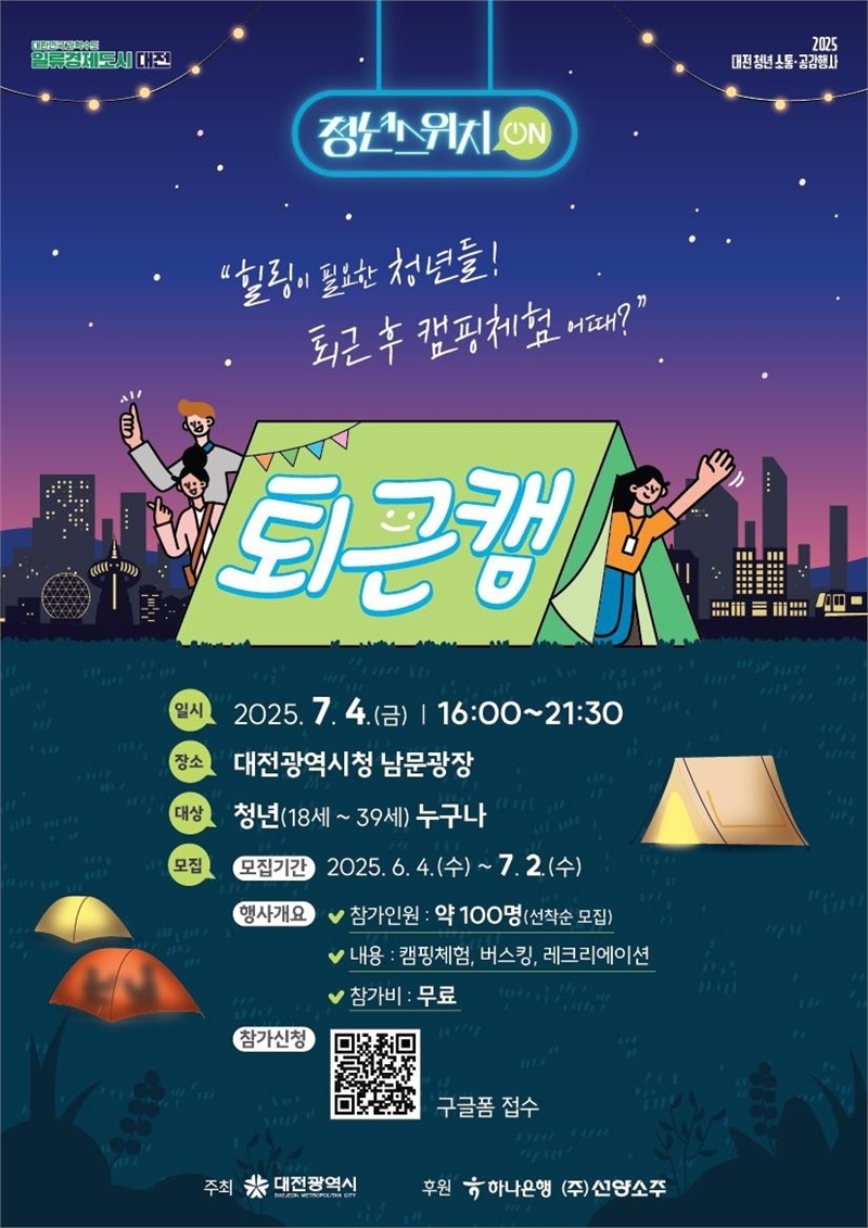 첫 행사는 4일 오후 4시 대전시청 남문광장에서 열리는 ‘청년 퇴근캠’이다. 직장인 청년들이 평일 퇴근 후 도심 속 캠핑 분위기에서 건강한 소통과 네트워킹을 즐길 수 있도록 마련됐다. 참가자들은 캠핑장처럼 꾸며진 행사장에서 캠핑 도시락으로 저녁 식사를 하며 이장우 시장과 허심탄회한 대화를 나누고, 퓨전앙상블과 어쿠스틱 듀오 밴드의 공연도 감상한다.