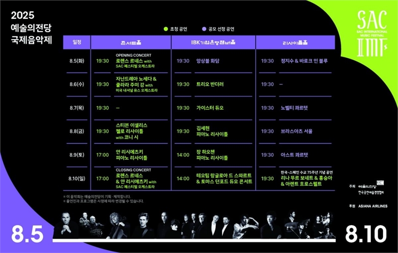 축제의 서막과 대미는 지휘자 로렌스 르네스와 SAC 페스티벌 오케스트라가 장식한다. 개막 공연에서는 R.슈트라우스 갈라가, 폐막 공연에서는 피아니스트 얀 리시에츠키와 베토벤 피아노 협주곡 3번, 말러 교향곡 1번 ‘거인’이 연주된다.