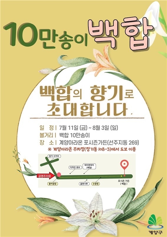 인천광역시 계양구는 계양아라온 내 포시즌가든에 10만 송이 백합이 만개해 오는 7월 11일부터 8월 3일까지 절정의 장관을 이룰 것이라고 밝혔다.