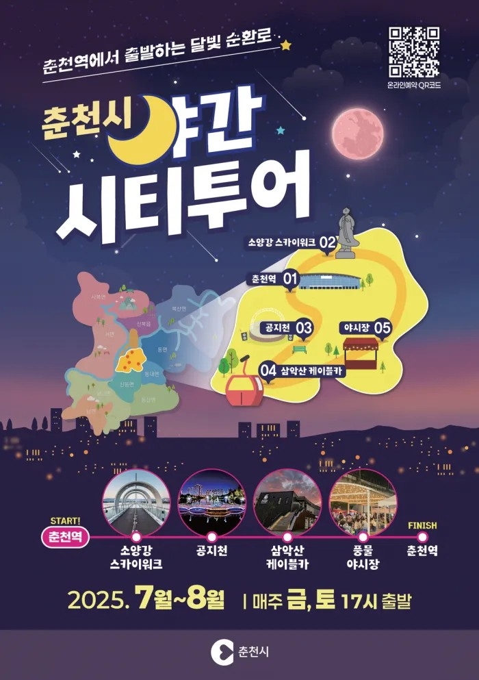 강원 춘천시는 여름철 야간 관광 활성화를 위해 7월부터 2개월간 매주 금요일과 토요일에 테마형 ‘야간 시티투어’를 운영한다고 밝혔다.