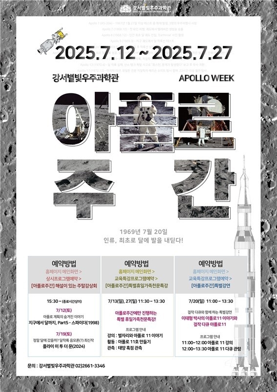 서울 강서구는 인류 최초의 달 착륙일(1969년 7월 20일)을 기념해 7월 12일부터 27일까지 강서별빛우주과학관에서 ‘아폴로 주간’ 특별 프로그램을 운영한다고 밝혔다. 이번 행사는 미항공우주국(NASA)의 아폴로 프로젝트를 주제로 우주 탐사의 도전정신과 미래 비전을 공유하기 위해 마련됐다.