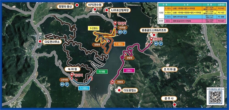 나주호 둘레길은 총 8.0km 구간으로, 한전 KPS연수원 도로 끝 지점부터 녹야원까지 1구간, 중흥리조트에서 다도광업소 앞까지 2구간으로 나뉘어 2025년 9월 전면 개통을 앞두고 있다.