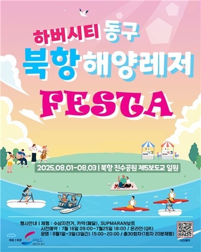부산 동구는 오는 8월 1일부터 3일까지 사흘간 북항 친수공원 경관수로에서 ‘하버시티 동구 북항 해양레저 페스타’를 개최한다고 밝혔다. 이번 행사는 누구나 무료로 참여할 수 있는 친환경 수상레저 체험 축제로, 여름 휴가철을 맞아 지역 주민과 관광객을 위한 색다른 해양문화 체험의 기회를 제공한다.