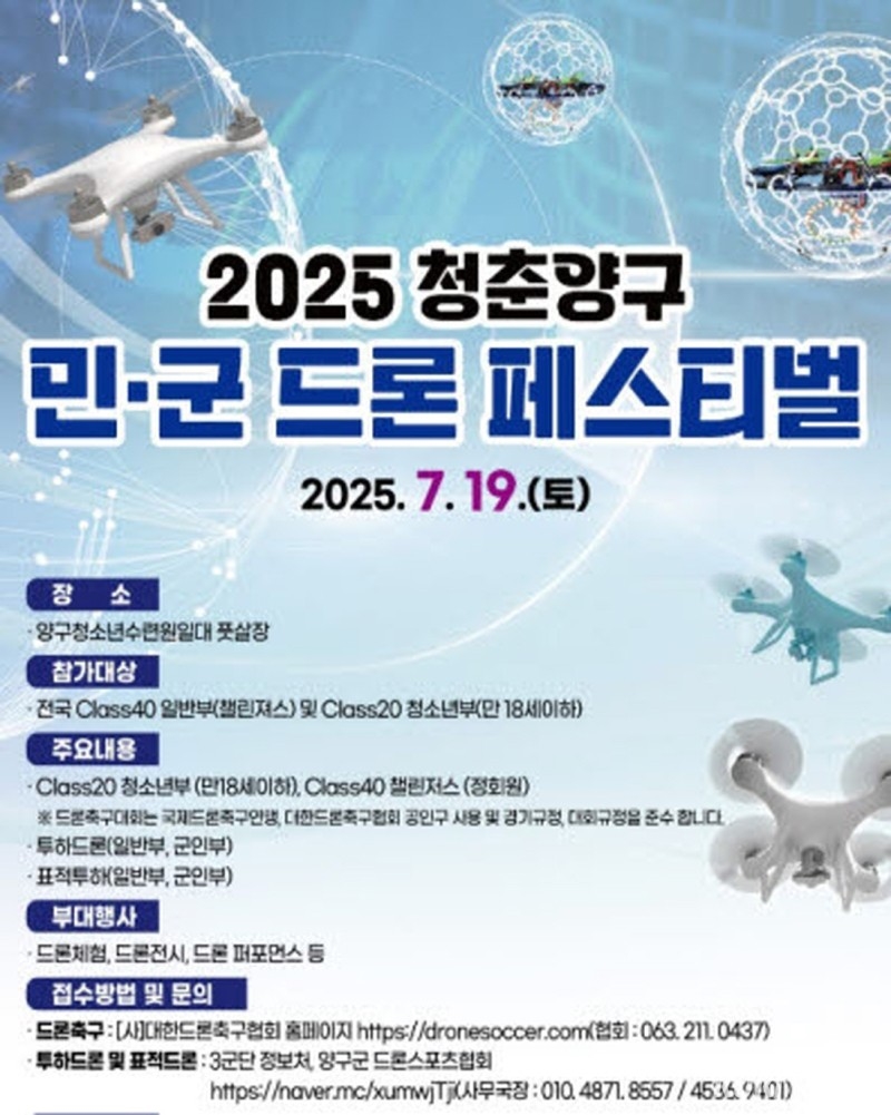 강원 양구군은 오는 19~20일 양일간 레포츠공원 일원에서 ‘2025 청춘양구 민‧군 드론 페스티벌’을 개최한다고 밝혔다.