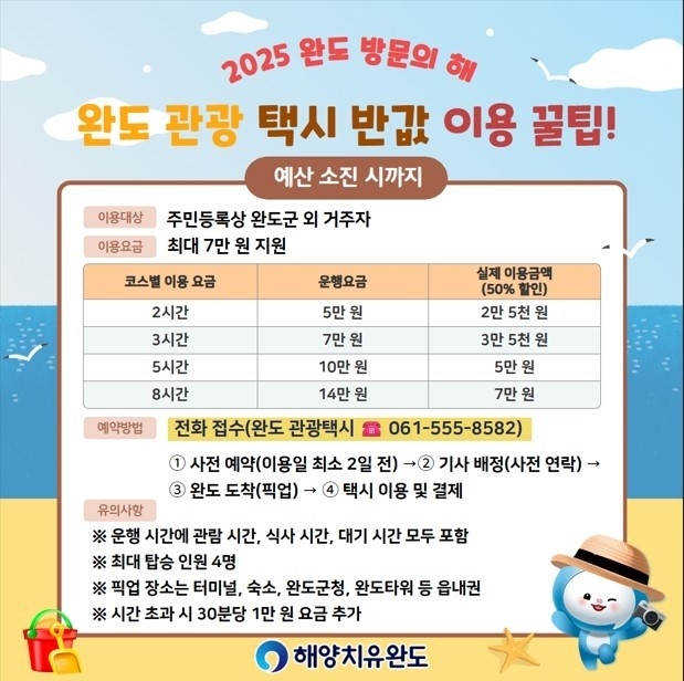전남 완도군이 '2025 완도 방문의 해'를 맞아 관광객 편의 증진을 위해 관광택시 반값 할인 이벤트를 시행하고 있다고 밝혔다.