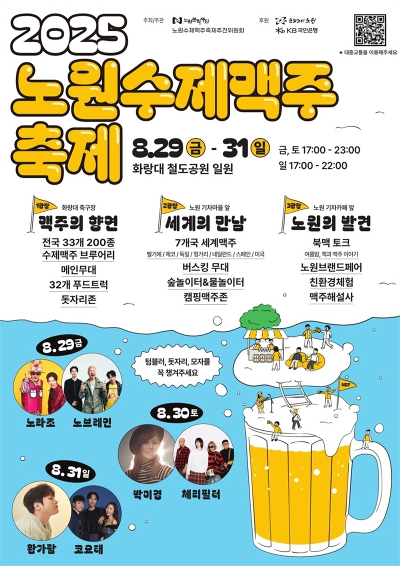 가장 먼저 8월 29일부터 31일까지 화랑대 철도공원 일원에서는 제3회 ‘노원수제맥주축제’가 열린다. 전국 33개 브루어리의 200여 종 수제맥주와 7개국 세계 맥주, 32대 푸드트럭이 한자리에 모이며, 맥주 전문가 해설 프로그램과 북토크, 가족 체험존도 함께 마련된다. 축제는 오후 5시부터 밤 11시(일요일은 10시까지)까지 야간 위주로 운영된다.