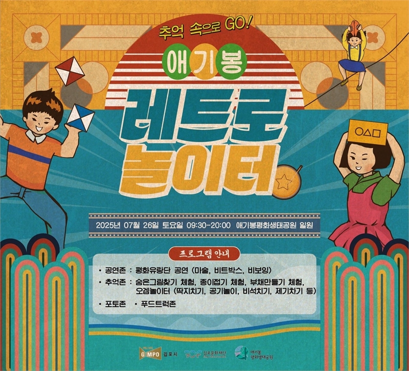 김포시가 오는 26일 여름방학을 맞아 글로벌 관광명소 애기봉 평화생태공원에서 ‘애기봉 레트로놀이터 이벤트: 추억 속으로!’를 개최한다고 밝혔다. 이번 행사는 세대 간 놀이문화를 체험하며 가족 단위 방문객에게 특별한 추억과 소통의 기회를 제공하기 위해 마련됐다.