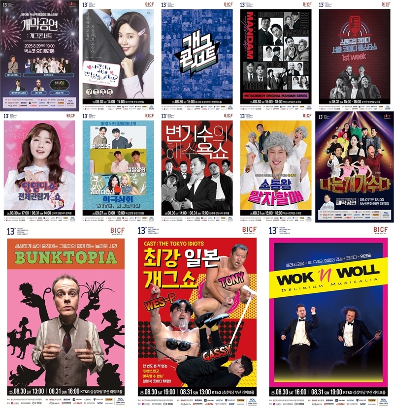 개막식은 8월 29일 부산 벡스코 오디토리움에서 열리며, KBS ‘개그콘서트’ 팀이 오프닝 공연을 장식하고 방송인 박명수가 개막식 MC를 맡는다. 본 행사에서는 연극, 토크쇼, 스탠드업, 인형극 등 장르를 넘나드는 다채로운 공연이 펼쳐진다.