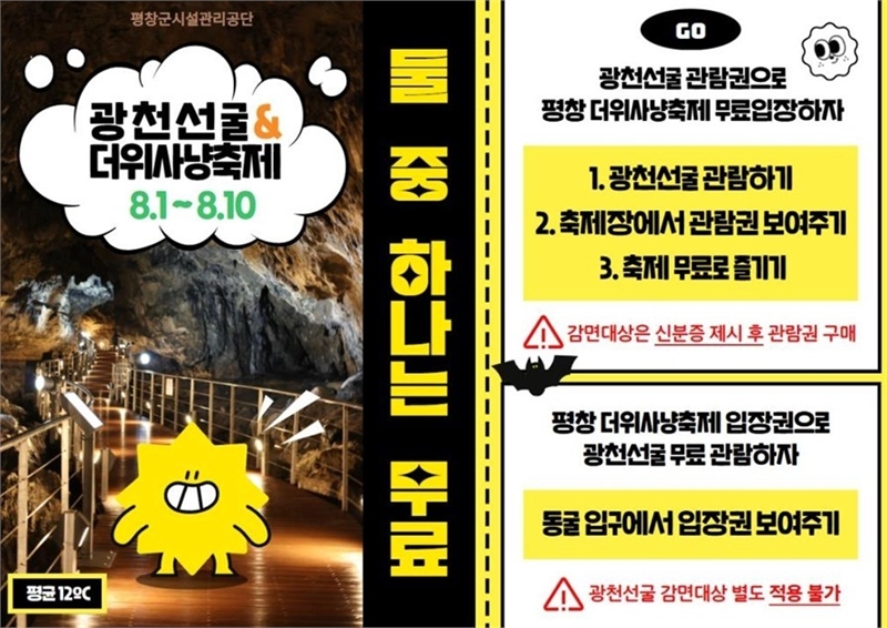 강원 평창군이 여름철 대표 피서지인 광천선굴과 지역 여름 축제인 ‘더위사냥축제’를 연계한 관광 혜택 이벤트를 마련했다. 평창군은 24일, 오는 8월 1일부터 10일까지 더위사냥축제 기간 중 광천선굴 또는 축제장 중 한 곳의 유료입장권을 소지하면 다른 한 곳은 무료로 이용할 수 있는 특별 연계 행사를 진행한다고 밝혔다.