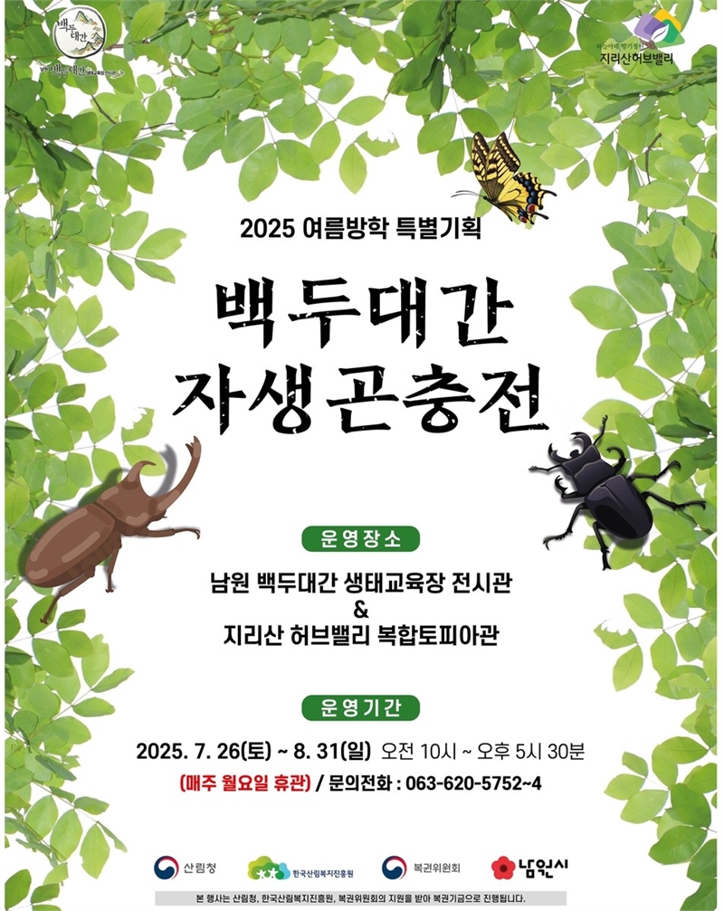 전북 남원시는 오는 7월 26일부터 8월 말까지 백두대간 생태교육장과 지리산 허브밸리에서 ‘백두대간 자생 곤충’ 특별전시회를 각각 개최한다고 밝혔다. 이번 전시회는 백두대간의 생물 다양성과 생태계의 소중함을 알리기 위한 교육·전시 행사로, 여름방학을 맞아 가족 단위 방문객들에게 유익한 생태 체험 기회를 제공한다.