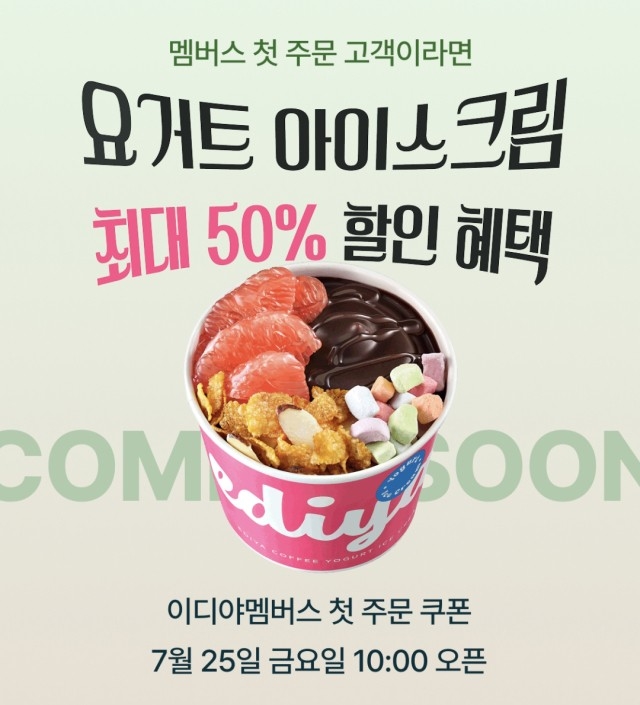 이번 행사는 ‘이디야멤버스’ 앱에 신규 가입했거나 아직 배달 또는 픽업 주문 이력이 없는 고객을 대상으로 진행된다. 선착순 3만 명에게는 신메뉴 ‘요거트 아이스크림’ 추천 세트 3종(달콤 초코, 든든 베리 망고, 상큼 자몽) 중 1종을 할인받을 수 있는 4100원 상당의 쿠폰이 제공된다. 쿠폰은 앱 내 이벤트 페이지에서 다운로드 가능하며, 주문 시 해당 쿠폰을 적용하면 할인된 가격으로 제품을 구매할 수 있다.