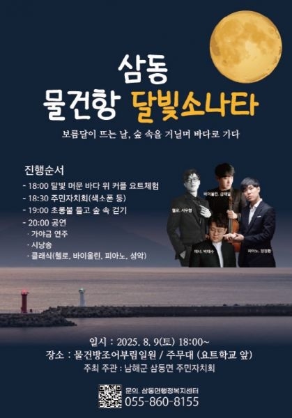 삼동면 주민자치회 한정여 회장은 “달빛소나타는 삼동의 자연과 주민이 함께 만들어가는 여름밤 축제”라며 “고즈넉한 항구의 분위기와 따뜻한 지역 정서를 느낄 수 있는 시간이 될 것”이라고 전했다.