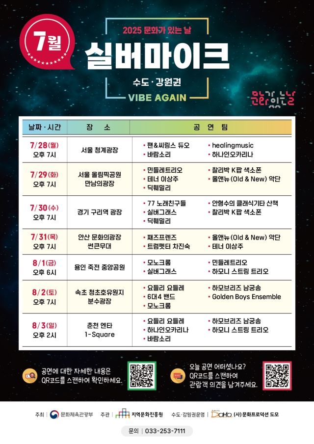문화체육관광부가 주최하고 지역문화진흥원이 주관하는 거리공연 프로그램 ‘2025 문화가 있는 날 실버마이크’ 수도·강원권 공연이 오는 8월 2일과 3일 속초와 춘천에서 각각 개최된다. 올해 수도·강원권 공연 운영은 문화프로덕션 도모가 맡았다.