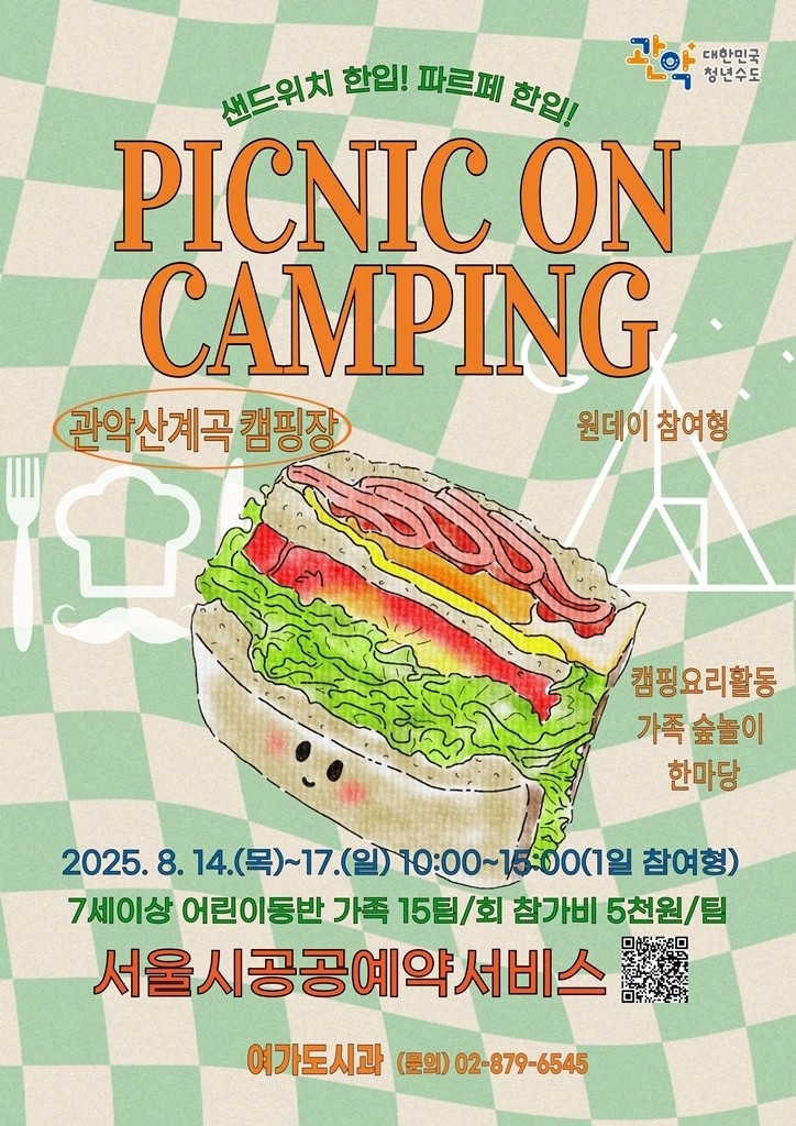 관악구는 여름방학을 맞아 관악산 계곡 캠핑장에서 가족이 함께 즐길 수 있는 산림생태 체험 프로그램 ‘피크닉 온(ON) 캠핑! 샌드위치 한 입, 파르페 한 입’을 8월 14일부터 17일까지 운영한다고 밝혔다.