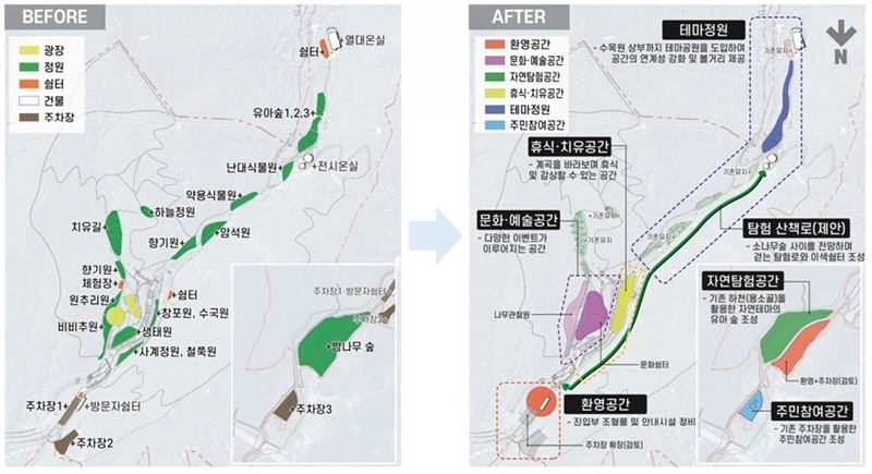 시는 2023년부터 내부 확장 계획을 수립하고, 주차장 확충, 디자인 데크로드 설치, 야간 경관 조명 확대 등 친환경 인프라를 지속 개선할 계획이다. 아울러 수목 유전자원 보전 기능을 강화하고, 차별화된 콘텐츠를 도입해 전국 대표 수목원으로의 도약을 목표로 하고 있다.