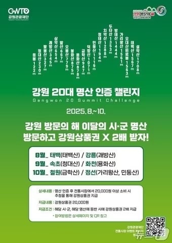 강원도와 강원관광재단은 ‘2025-26 강원 방문의 해’를 기념해 도내 20대 명산과 18개 전통시장을 연계한 ‘명산 인증 챌린지 전통시장 이벤트’를 오는 10월까지 확대 운영한다고 밝혔다.