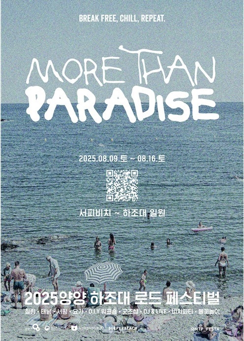 강원 양양군은 오는 9일부터 16일까지 8일간 현북면 서피비치와 하조대 일원에서 ‘2025 양양 하조대 로드 페스티벌(More than Paradise)’을 개최한다고 밝혔다. ‘BREAK FREE, CHILL, REPEAT’를 주제로 열리는 이번 축제는 지역 상점, 주민, 방문객이 함께 참여하는 로컬 기반 문화축제로, 공연을 넘어선 지역문화 플랫폼으로 주목받고 있다.