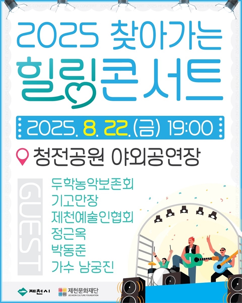 제천시는 오는 8월 22일 오후 7시, 새롭게 정비를 마친 청전야외공연장에서 2025년 ‘찾아가는 힐링콘서트’를 개최한다고 밝혔다.