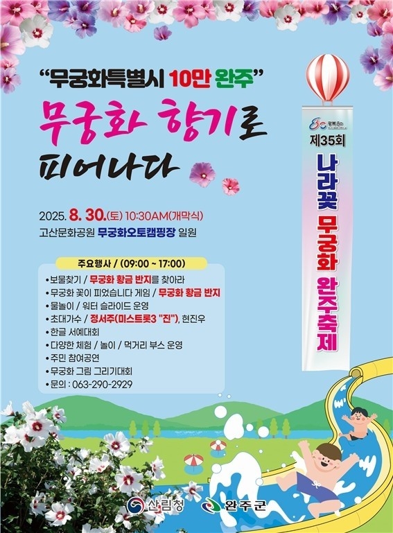 완주군이 광복 80주년을 맞아 ‘광복 80년, 무궁화특별시 10만 완주, 무궁화 향기로 피어나다’를 슬로건으로 한 ‘제35회 나라꽃 무궁화 완주축제’를 오는 30일 고산문화공원(무궁화테마식물원 일원)에서 개최한다.