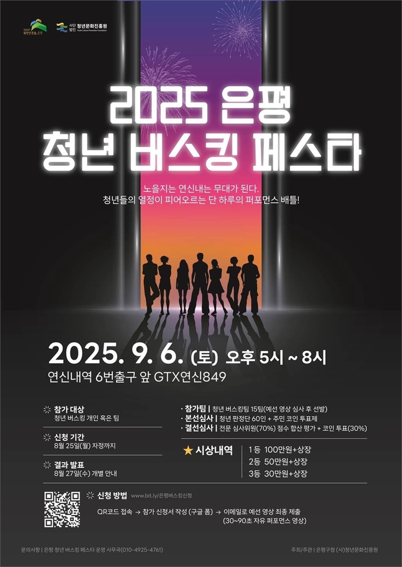 은평구(구청장 김미경)는 오는 9월 6일 오후 5시 GTX연신849(옛 물빛공원)에서 ‘은평 청년 버스킹 페스타’를 개최한다고 밝혔다. 이번 행사는 지역 청년들이 무대의 주인공이 되어 자신만의 개성과 끼를 펼치는 청년 문화 축제로 꾸며진다.