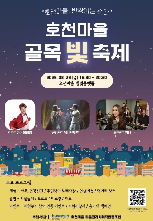 부산진구 범천2동 호천마을 마을관리사회적협동조합은 오는 8월 29일 오후 4시 30분부터 8시 30분까지 호천마을 별빛플랫폼 일원에서 ‘호천마을 골목 빛 축제’를 개최한다고 밝혔다. 이번 축제는 야경이 아름다운 호천마을의 매력을 널리 알리고 주민이 함께 어울리는 공동체 분위기를 조성하기 위해 마련됐다.