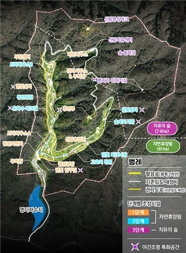 조성 예정 부지는 휴양림 81㏊와 치유의 숲 74㏊로 나뉘며, 방문자센터, 트리하우스, 산림휴양관, 전망대, 산림치유센터, 명상데크 등이 단계적으로 들어설 예정이다. 이 사업에는 충북도와 옥천군 예산 268억원이 투입된다.
