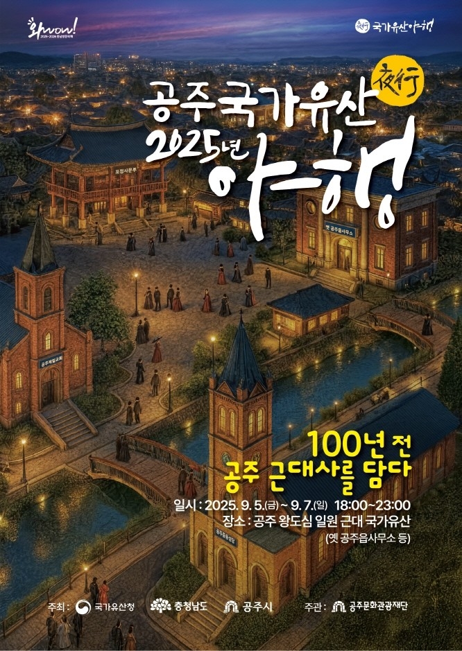 충남 공주시는 내달 5일부터 사흘간 구도심 일대에서 ‘2025 공주 국가유산 야행’을 개최한다고 밝혔다. 이번 행사는 옛 공주읍사무소와 중동성당 등 역사·문화 자원을 배경으로 공주의 근대사를 체험할 수 있도록 마련됐다.