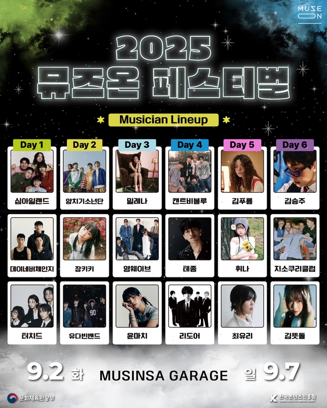 문화체육관광부와 한국콘텐츠진흥원은 국내 대표 인디 음악 축제 ‘2025 뮤즈온 페스티벌’을 9월 2일부터 7일까지 6일간 서울 합정 무신사 개러지에서 개최한다고 밝혔다. 이번 페스티벌은 예매 시작 10분 만에 전석이 매진되며 높은 관심을 입증했다.