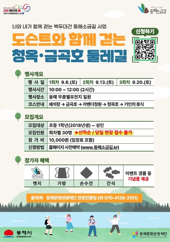 정연수 동해문화관광재단 대표이사는 “동해소금길은 단순한 트레킹 코스가 아니라 지역의 역사와 문화를 간직한 소중한 자원”이라며 “이번 프로그램을 통해 동해소금길이 시민과 관광객에게 더욱 알려지길 기대한다”고 말했다.