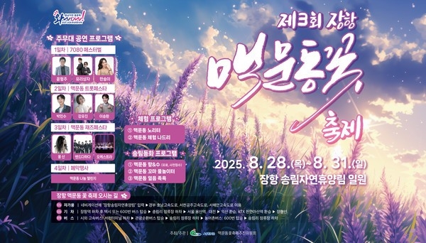충남 서천군은 오는 28일부터 31일까지 나흘간 장항 송림자연휴양림 일원에서 ‘제3회 장항 맥문동 꽃 축제’를 개최한다고 밝혔다. 국내 최대 규모인 약 28만㎡의 맥문동 군락지에서 열리는 이번 축제는 보랏빛 꽃물결과 함께 다양한 공연과 체험 프로그램을 즐길 수 있는 감성 축제로 꾸며진다.