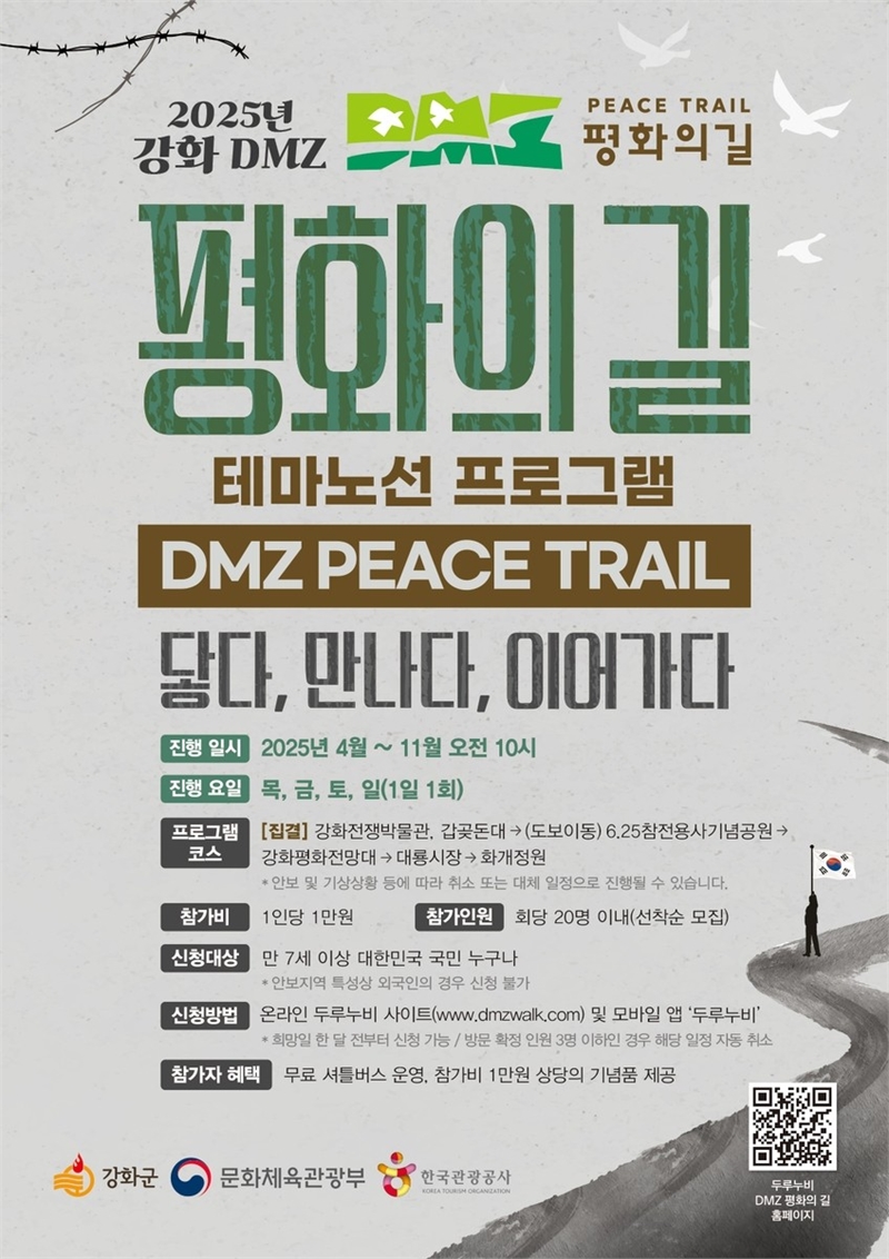 운영은 매주 목요일부터 일요일까지 주 4일 진행되며, 시간은 오전 10시부터 오후 4시까지다. 코스는 강화전쟁박물관(갑곶돈대), 6·25참전용사기념공원, 강화평화전망대, 대룡시장, 화개정원 등으로 구성됐다. 참가비는 1만 원이며, 지역 특산품으로 환급받을 수 있어 지역경제에도 기여한다. 참여 신청은 평화의 길 누리집(www.dmzwalk.com) 또는 코리아둘레길 모바일 앱 ‘두루누비’를 통해 가능하다.