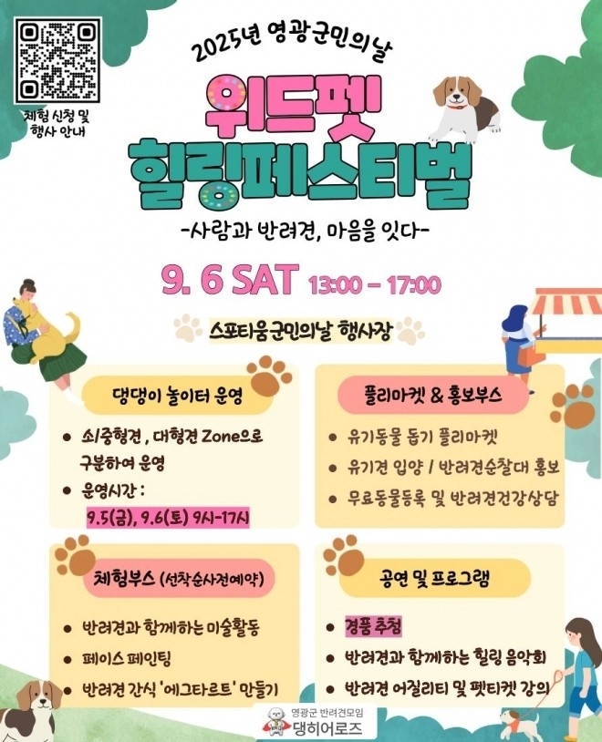 영광군민의 날 추진위원회 관계자는 “위드펫 힐링페스티벌은 단순한 반려견 행사가 아니라 반려인과 비반려인이 함께 어울려 교감할 수 있는 자리”라며 “지역 사회의 유기동물 문제 해결과 올바른 반려동물 문화 확산에도 큰 기여를 할 것”이라고 말했다.
