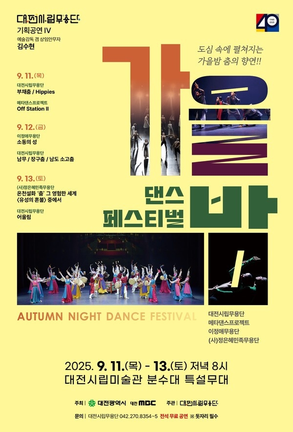 대전시립무용단은 오는 9월 11일부터 13일까지 대전시립미술관 분수대 특설무대에서 제24회 기획공연 ‘가을밤 댄스 페스티벌’을 개최한다고 밝혔다. 올해 공연은 시립무용단 창단 40주년을 기념해 지역 대표 무용단들이 함께하는 무대로 꾸며진다.