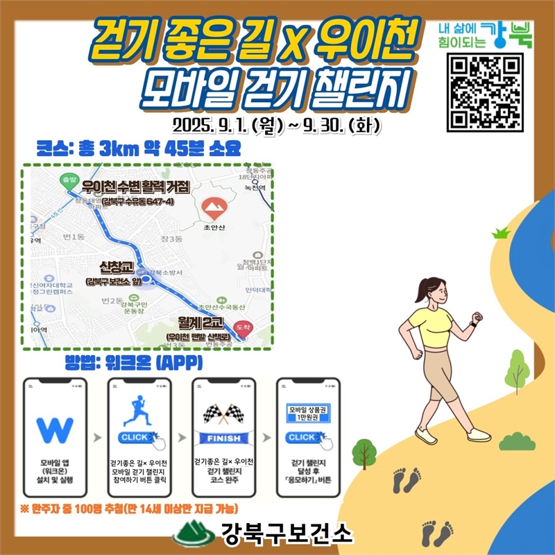 이번 걷기 챌린지는 강북구민을 대상으로 하며, 걷기 명소로 꼽히는 우이천 산책로 일대에서 진행된다. 코스는 우이천 수변활력거점에서 출발해 신창교를 지나 월계2교 맨발 산책로까지 이어지는 총 3km 구간이다.