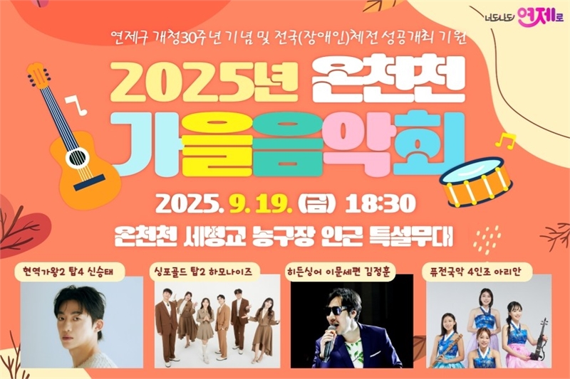 연제구(구청장 주석수)는 오는 9월 19일 오후 6시 30분 온천천 세병교 인근 특설무대에서 ‘2025년 온천천 가을음악회’를 개최한다고 밝혔다. 이번 음악회는 구청 개청 30주년을 기념하는 동시에, 25년 만에 부산에서 열리는 전국장애인체전의 성공적 개최를 기원하는 의미를 담았다. 뜨거운 여름을 지나 풍성한 가을의 시작을 알리는 계절 음악회로 지역 주민과 함께 음악으로 소통하는 자리가 될 전망이다.