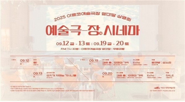 한국문화예술위원회는 오는 12~13일과 19~20일 서울 대학로 아르코예술극장 앞마당에서 공연예술 작품 실황과 댄스필름을 상영하는 ‘예술극-장(場) 시네마’를 개최한다고 밝혔다.