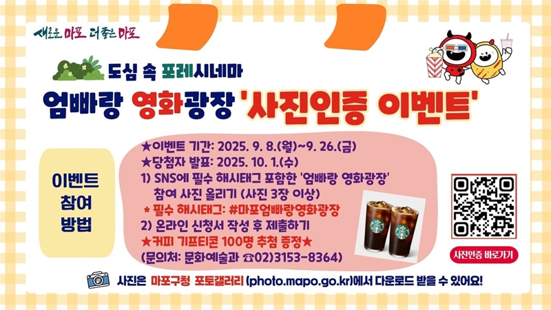 마포구(구청장 박강수)는 구민광장에서 열린 ‘도심 속 포레시네마 – 엄빠랑 영화 광장’을 기념해 누구나 참여할 수 있는 ‘엄빠랑 영화광장 사진인증 이벤트’를 9월 8일부터 26일까지 진행한다고 밝혔다.