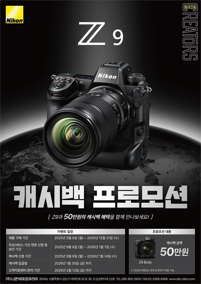 이번 이벤트는 Z9 구매 고객에게 총 50만원의 캐시백 혜택을 제공하는 방식으로 진행된다. 행사 기간은 올해 12월 31일까지이며, 내년 1월 7일까지 무상 서비스 기간 연장 신청을 마친 뒤 같은 달 14일까지 이벤트 신청을 완료하면 혜택을 받을 수 있다. 캐시백은 2026년 1월 30일 일괄 지급된다. 자세한 사항은 니콘이미징코리아 공식 홈페이지에서 확인할 수 있다.