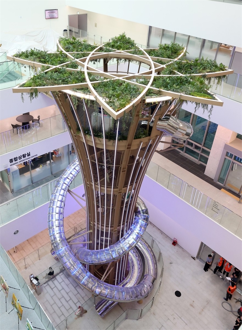 동작구(구청장 박일하)는 신청사 지하 1층 중앙홀에 높이 15m 규모의 초대형 슬라이드 ‘D-Lide’(가칭)를 설치하고 지난 4일부터 운영을 시작했다고 밝혔다. 이 시설은 아이들뿐 아니라 성인도 무료로 이용할 수 있는 체험형 조형물로 마련됐다.