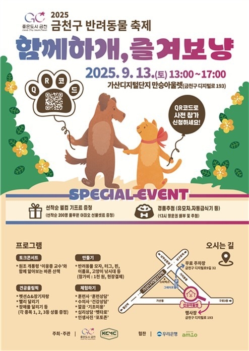 금천구(구청장 유성훈)는 오는 9월 13일 오후 1시 가산G밸리 만승아울렛(금천구 디지털로 193)에서 2025년 반려동물 축제 ‘함께하개, 즐겨보냥’을 개최한다고 밝혔다. 이번 행사는 가산지역 대표 축제인 ‘금천 GC 페스타’와 연계해 열리며, 반려인과 비반려인이 함께 어울릴 수 있는 다양한 프로그램으로 꾸며진다.