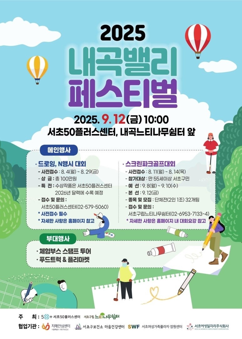 대표 프로그램은 드로잉·N행시 대회다. 사전 접수는 8월 29일까지 마감됐으며 현장 접수도 가능하다. 대회 주제는 당일 발표되며, 일반·디지털 부문으로 열리는 드로잉 대회에는 인근 어린이집 어린이들도 참여해 창의적인 작품을 선보인다. 드로잉 부문 4명, N행시 부문 5명 등 총 9명의 수상작은 내년도 서초50플러스센터 달력에 실려 주민들에게 특별한 의미를 더한다.